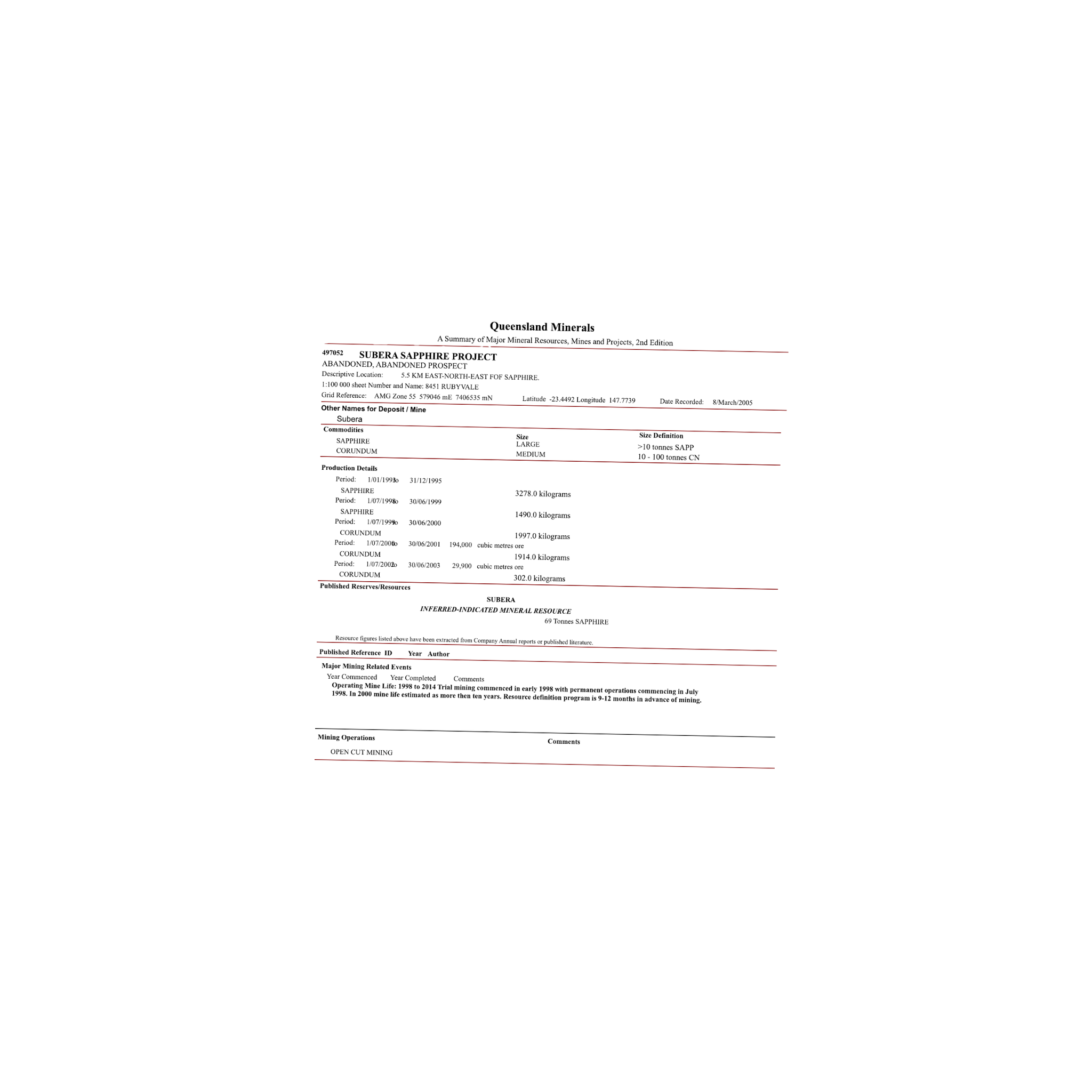 The Subera Sapphire Project operated as a private mining venture, drawing from sapphire-bearing basaltic gravels characteristic of this part of Queensland. During its active years, it yielded a remarkable concentration of gem-quality rough — stones known for their vivid natural colour, size, and clarity. The material extracted from Subera was considered among the top few percent of all sapphire recovered from the Australian gem fields, with striking blues, greens, yellows, and parti tones that came to define the region’s reputation.