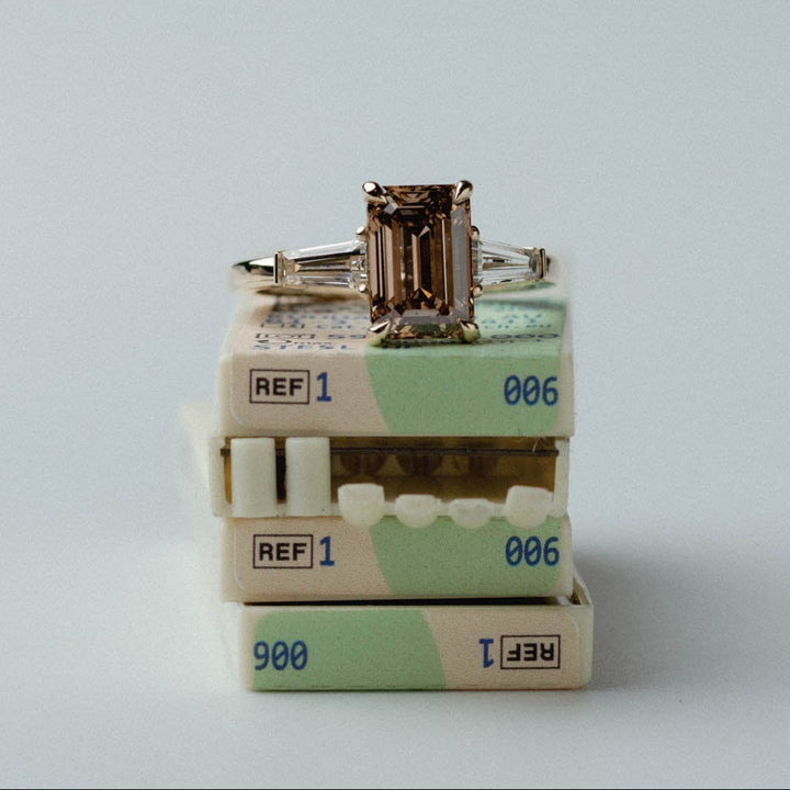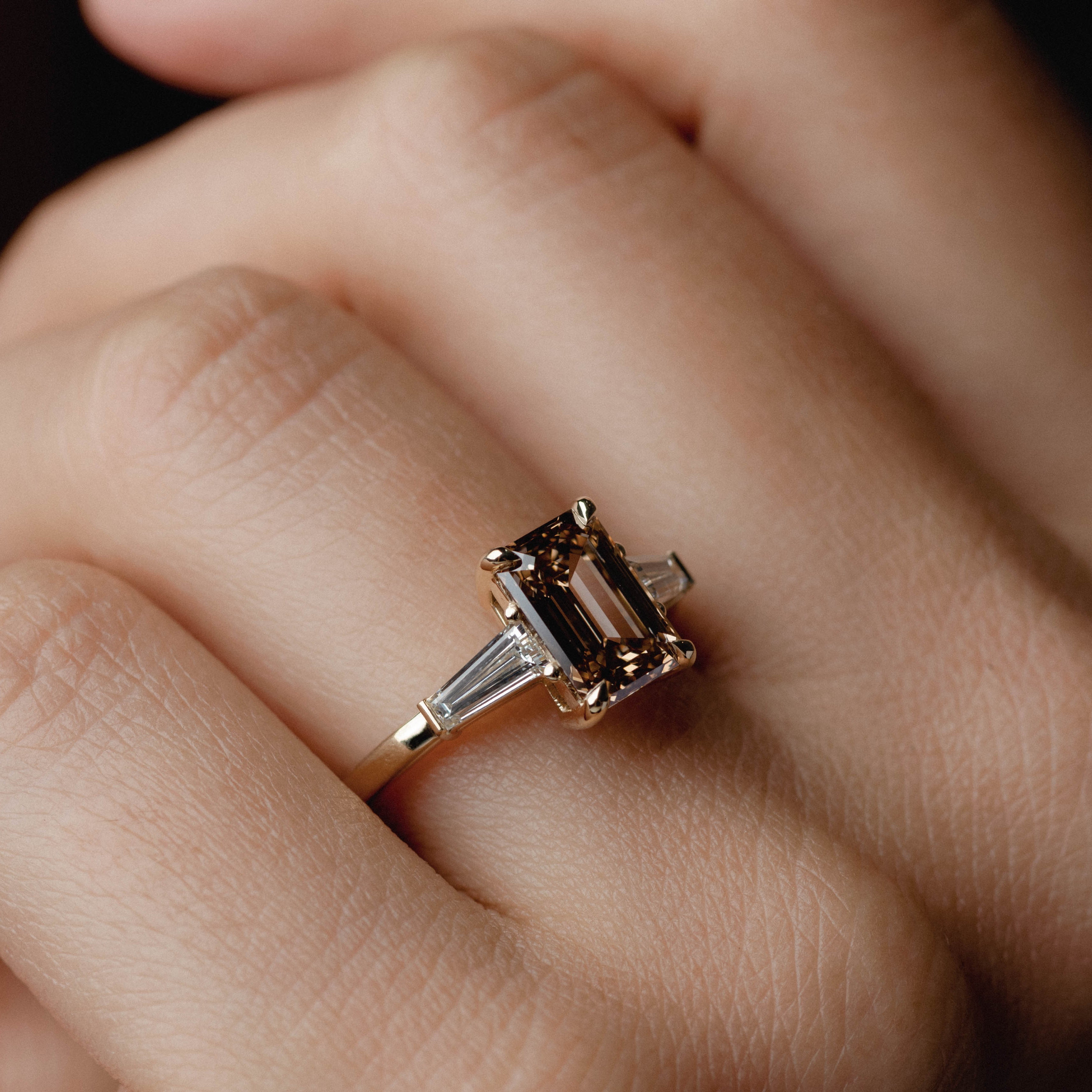2.09ct Three Stone of Champagne Emerald Lab Diamond & Tapered Baguette