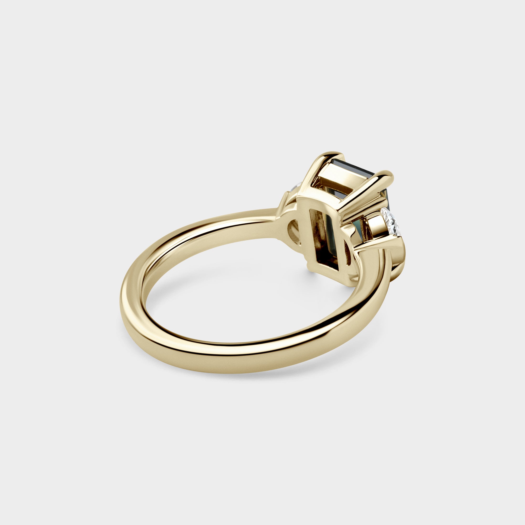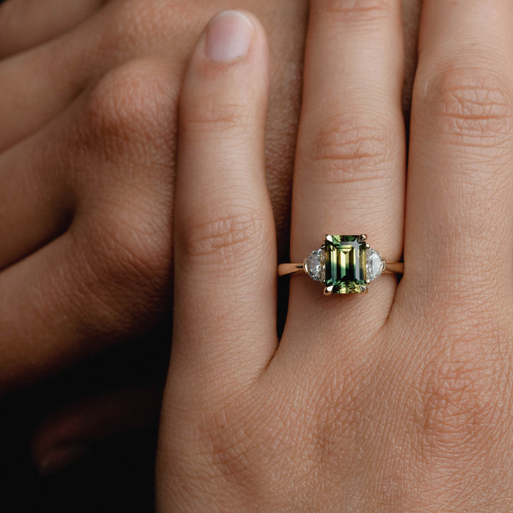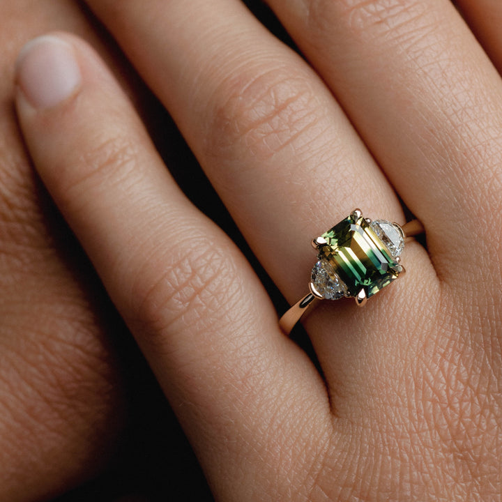 2.68ct Three Stone of Yellow/Blue Parti Sapphire & Half Moon Cut