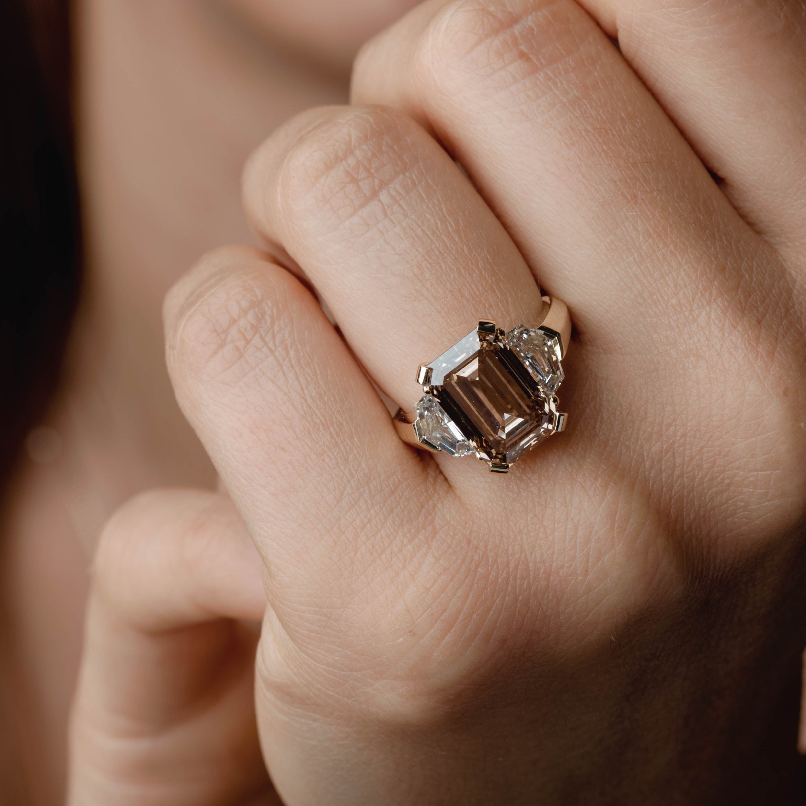 6.09ct Three Stone of Champagne Emerald & Cadillac Diamond